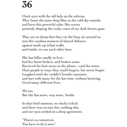 I lock eyes with the old lady on the subway. They beam the same deep blue as the cold sky outside, and have this powerful calm, like waves patiently shaping the rocky coast of my dark brown gaze.