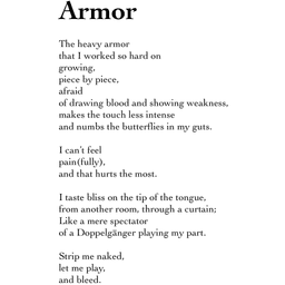 The heavy armor that I worked so hard on growing, piece by piece, afraid of drawing blood and showing weakness, makes the touch less intense and numbs the butterflies in my guts.