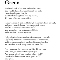 Our colors and hair intertwined like thirsty vines, and I plunged head first into your eyes. And as you asked: “can you feel what I feel?”. I realized—there was no more “you” or “I”, only green.