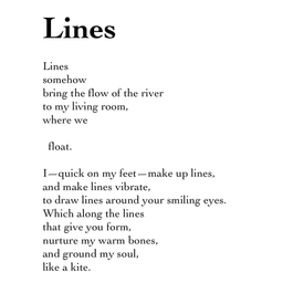 I—quick on my feet—make up lines, and make lines vibrate, to draw lines around your smiling eyes. Which along the lines that give you form, nurture my warm bones, and ground my soul, like a kite.