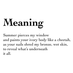 Summer pierces my window blinds and paints your ivory body like a cheetah, as your nails shred my bronze, wet skin, to reveal what’s underneath it all.