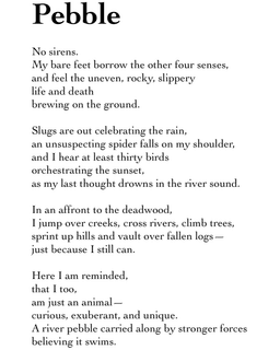 Here I am reminded, that I too, am just an animal— curious, exuberant, and unique. A river pebble carried along by stronger forces believing it swims.