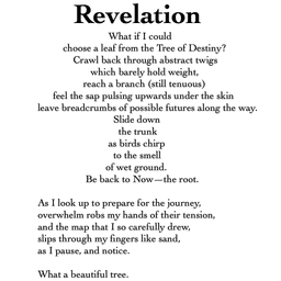 What if I could choose a leaf from the Tree of Destiny? Crawl back through abstract twigs which barely hold weight, reach a branch (still tenuous) feel the sap pulsing upwards under the skin leave breadcrumbs of possible futures along the way. Slide down the trunk as birds chirp to the smell of wet ground. Be back to Now—the root.