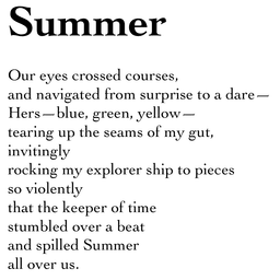 Our eyes crossed courses, and navigated from surprise to a dare— Hers—blue, green, yellow— tearing up the seams of my gut, invitingly rocking my explorer ship to pieces so violently that the keeper of time stumbled over a beat and spilled Summer all over us.