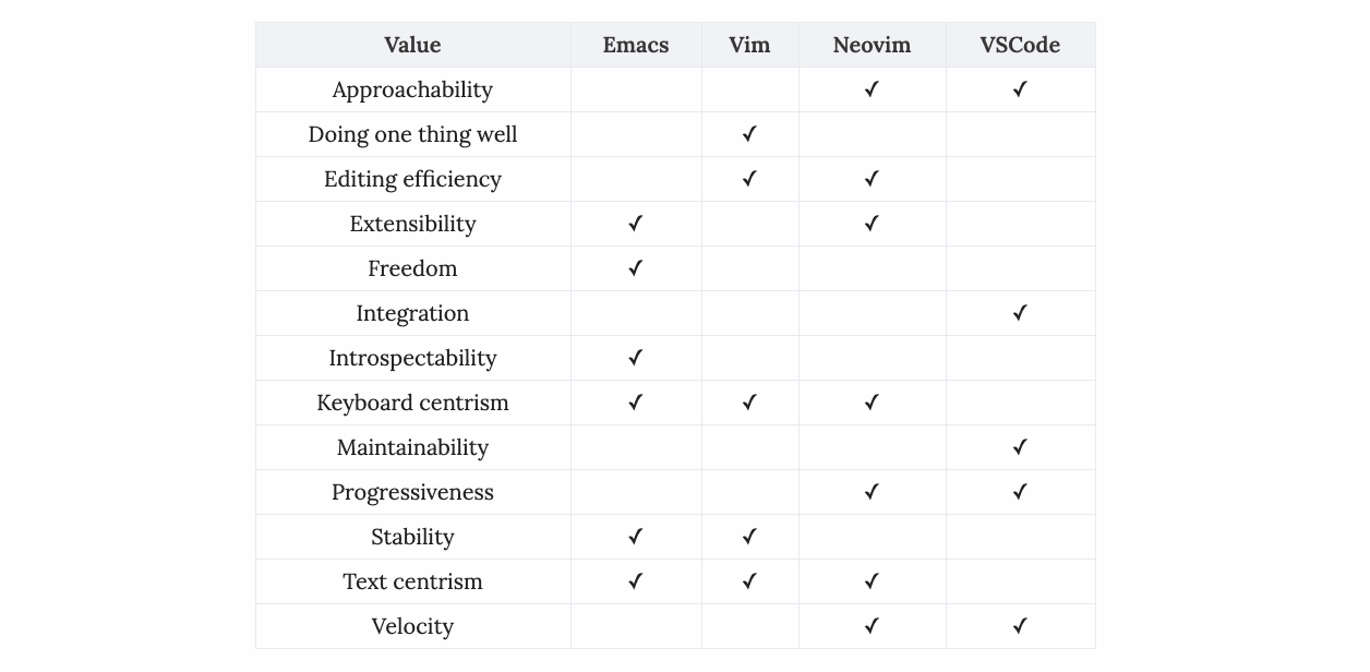 Comparing the core values of our text editors, describing the history of Neovim's development, and discussing the rise of VSCode.