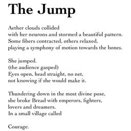She jumped. (the audience gasped) Eyes open, head straight, no net, not knowing if she would make it.