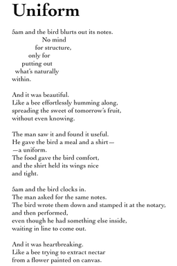 5am and the bird blurts out its notes. No mind for structure, only for putting out what’s naturally within.