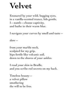 Ensnared by your wild, begging eyes, in a vanilla-scented trance, lids gentle, I—numb—choose captivity, and bathe in their warm blue.