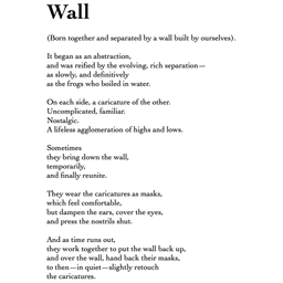 And as time runs out, they work together to put the wall back up, and over the wall, hand back their masks, to then—in quiet—slightly retouch the caricatures.